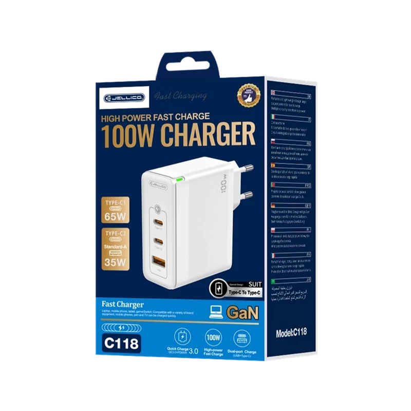 GaN PD+PD+QC 100W ( 3 ports supporting fast charger) -Jellico C118