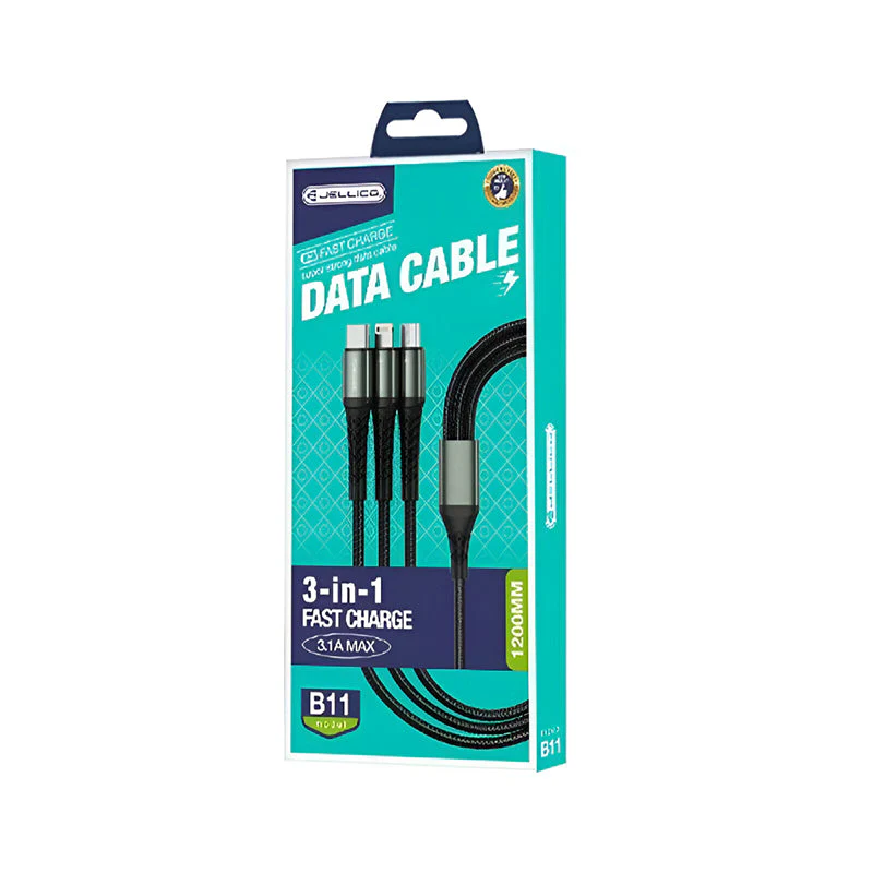 Met de 3 in 1 1.2M Cable B11 van Jellico heb je alles wat je nodig hebt in één kabel. Snel, efficiënt en perfect voor al je opladingbehoeften!