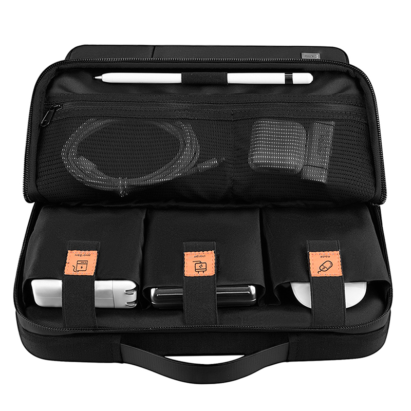 Naast de opbergruime voor de laptop beschik je aan de voorzijde over 3 verschilende volledig met rits afsluitbare vakken. Zo is de linkerzijde gemaakt voor het opbergen van een muis en opladers. Perfect voor het georganiseerd houden van de tas met drie kleine en 1 grote vak. Aan de voorkant beschik je in de voorvak een handige sleutelhanger en nog wat ruimte voor pennen en schrijfgerei. En in de laatste vak, tevens de grootste bijvak, is het mogelijk om wat documenten of een iPad op te bergen. Aan de achterkant beschikt de tas over een handige strip waarmee het mogelijk is om de tas aan de handvat van een reiskoffer te vestigen.