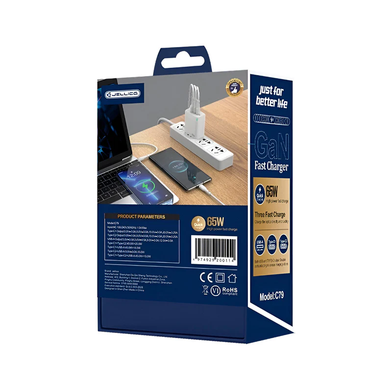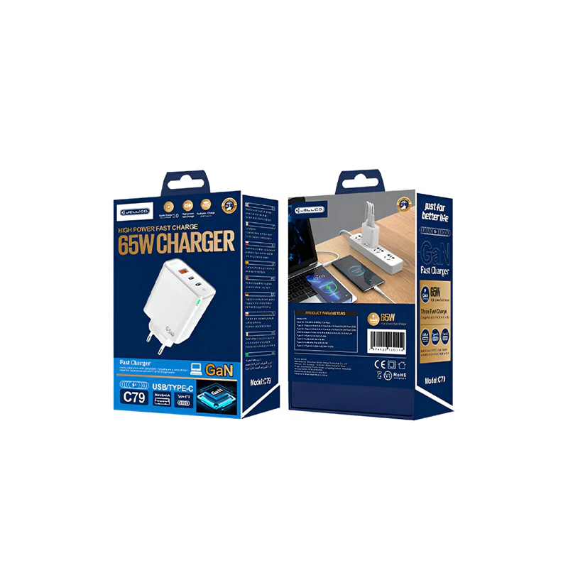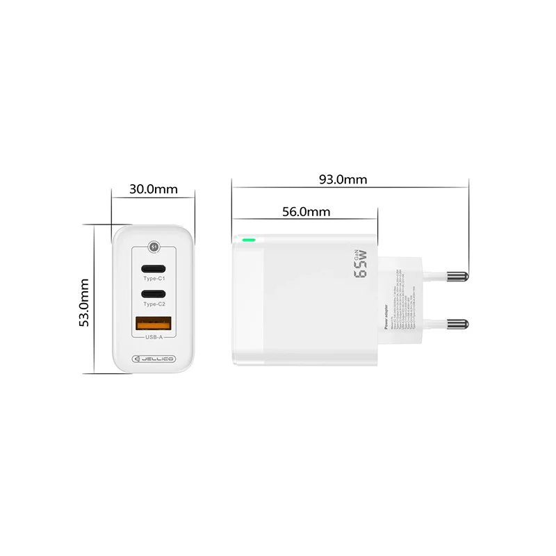 Met de GaN PD+PD+QC 65W Adapter C79 van Jellico krijg je de kracht en snelheid die je nodig hebt om je apparaten snel en efficiënt op te laden, waar je ook bent.