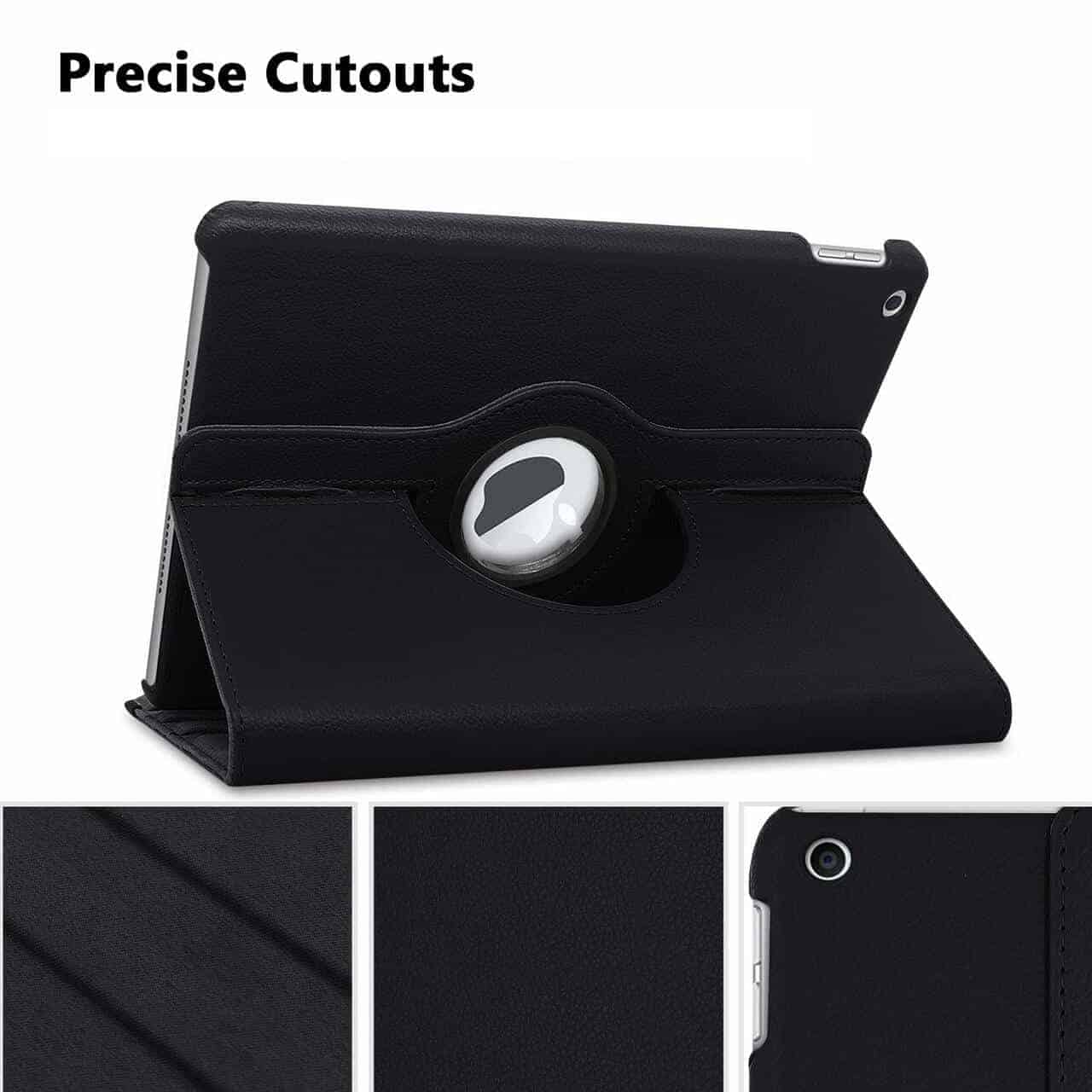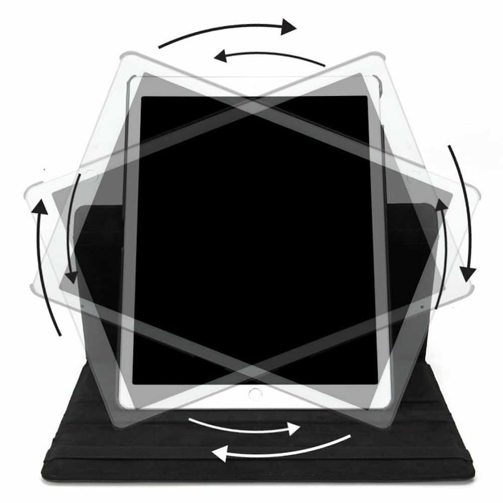 Het hoesje heeft een scharnier in het midden waardoor deze 360 graden draaibaar is. Dankzij dit systeem is het mogelijk om de tablet zowel horizontaal als verticaal neer te zetten. Dit maakt video’s bekijken of het lezen van een pagina plezierig. Daarnaast zijn er twee gleuven gemaakt in het hoesje zodat het toestel stevig op een tafel neergezet kan worden zonder dat het omvalt. De cover is gemaakt van sterk kunststof en gaat met behulp van een extra elastiek helemaal dicht. Dit voorkomt dat het hoesje zomaar open valt. Het merk is van Fonu.