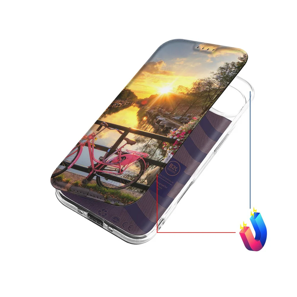 De hoes is opgebouwd als een standcase met magneetafsluiting aan de binnenkant, zodat je altijd snel kunt openen en sluiten. De binnenzijde heeft een TPU-houder die het toestel rondom omsluit en tegelijk licht en flexibel blijft. De buitenkant is bedrukt met het beeld van Amsterdamse grachten, zodat elke aanraking een stille herinnering aan de stad is. De combinatie van kunstleer, siliconen en TPU geeft de hoes een zacht, premium gevoel en zorgt ervoor dat hij dagelijks meegaat—zonder poespas, wel met karakter.