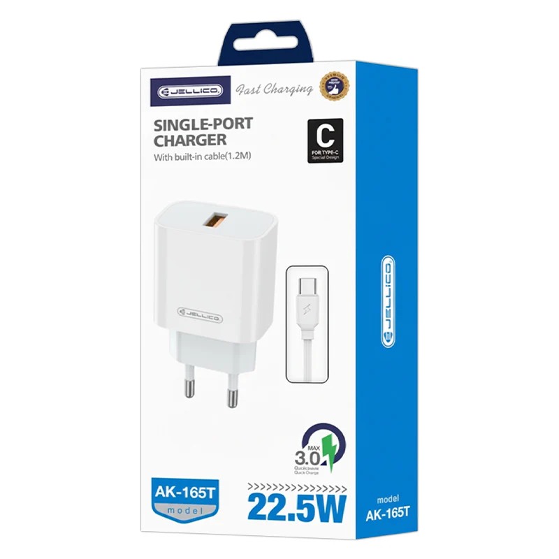 De Jellico AK-165T is een compacte en krachtige single-poort oplader met een geïntegreerde 1,2 meter lange Type-C kabel, ideaal voor snel opladen van smartphones, tablets en andere compatibele apparaten. Met een vermogen van 22,5W biedt deze oplader een efficiënte en veilige oplaadervaring.