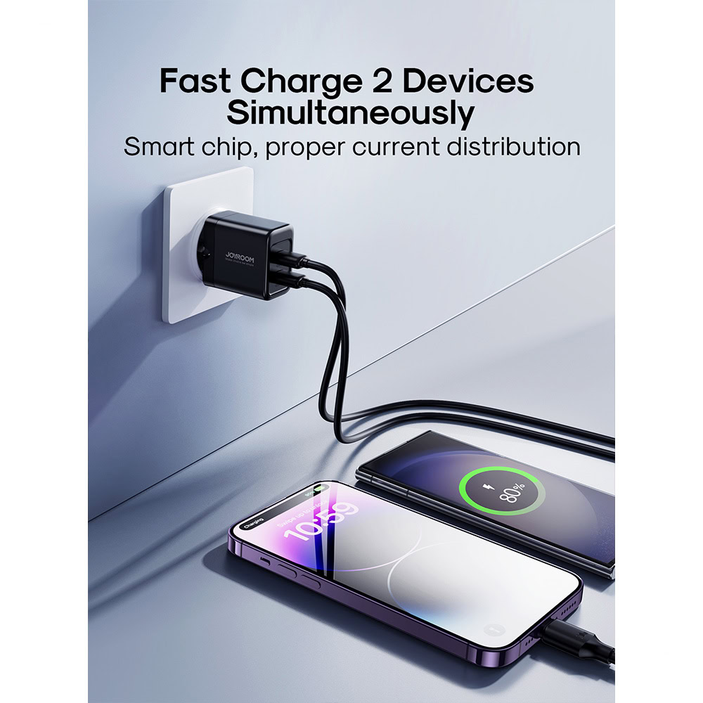 Laad twee apparaten tegelijkertijd op met de Joyroom 12W Dual-Port USB-A oplader. Met een totaal vermogen van 12W en slimme stroomverdeling zorgt deze oplader voor een veilige en efficiënte laadsessie.