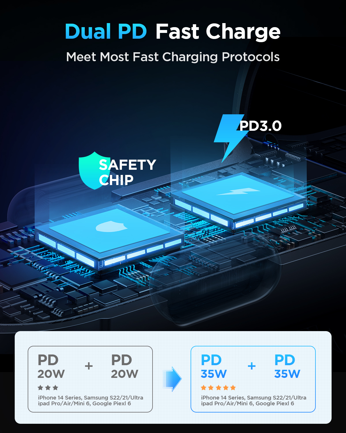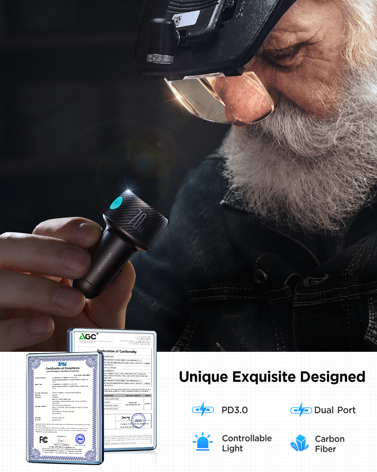 Het product is een 70W multikleurige autolader met een lichtknop. Het heeft twee PD-uitgangspoorten en biedt snelladen voor 2 apparaten tegelijkertijd.