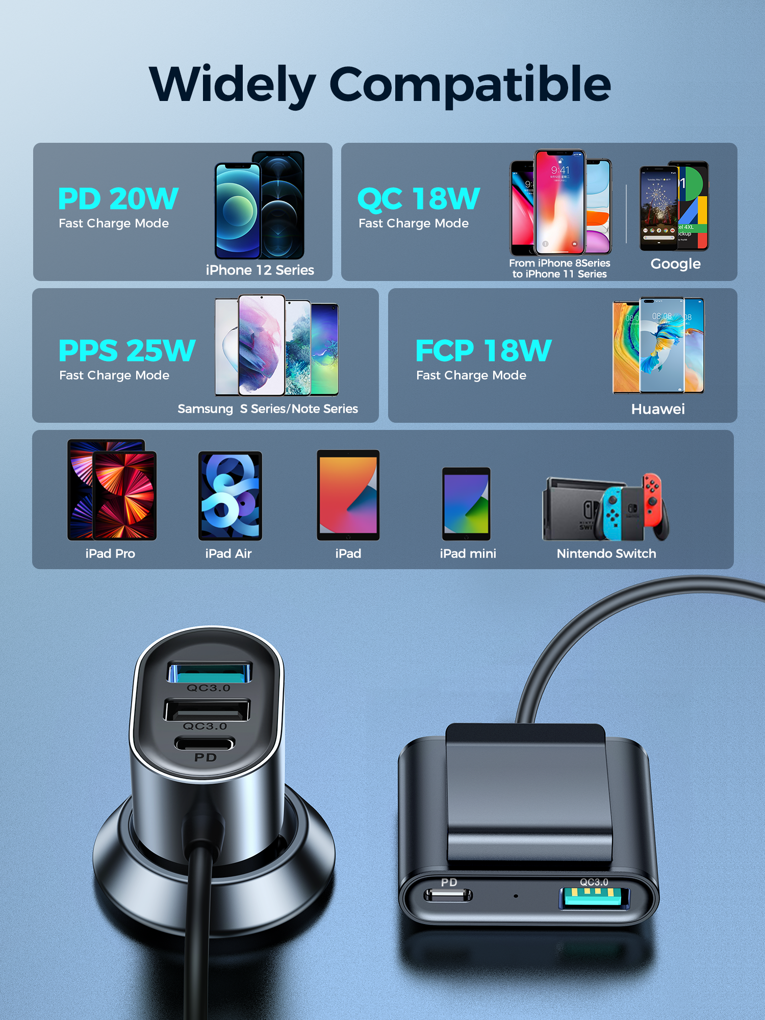 Het gebruik van hoogwaardig ABS en PC zorgt voor antislip eigenschappen. Je kunt de lader eenvoudig aansluiten en loskoppelen van de sigarettenaansteker, zelfs tijdens het rijden. Het is ook veilig tijdens het opladen – het materiaal is bestand tegen hoge temperaturen.