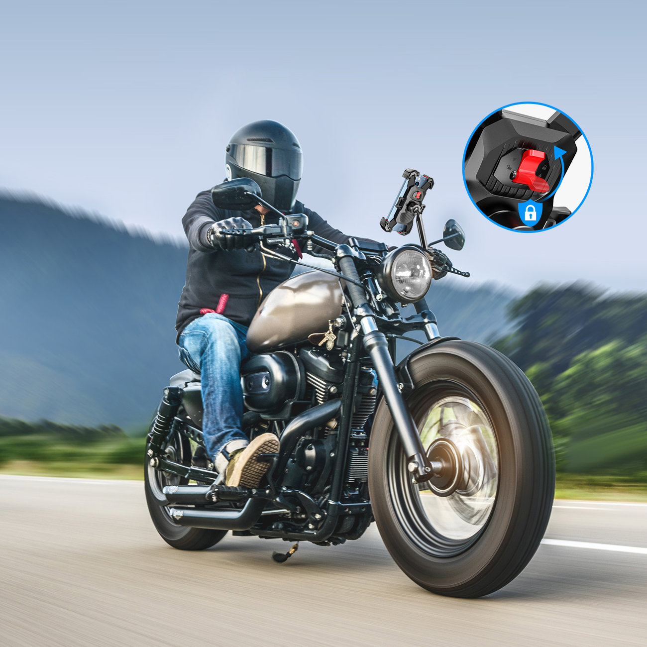 Sterke constructie. De houder kun je gemakkelijk bevestigen aan de spiegel van de motorfiets. De ring wordt stevig vastgedraaid, en het binnenste deel gebruikt een materiaal dat voorkomt dat het beweegt, glijdt of verschuift op het frame. Hierdoor kun je vrij rijden, zonder je zorgen te maken dat de houder zal draaien en je telefoon zal vallen.