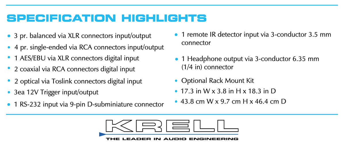 De digitale module ondersteunt tot 24 bit/192kHz LPCM. Alle digitale signalen worden naar een ESS Sabre DAC gevoerd en vervolgens naar Krell’s Current Mode, discrete, gebalanceerde analoge circuits gestuurd. Hoogtepunten van de voeding De voeding is te groot voor een voorversterker en heeft een transformator van 95 VA en een capaciteit van 40.000 F, waardoor hij snel kan reageren op muzikale eisen. De grote voeding verbetert de ruisonderdrukking en maakt de Illusion II ongevoelig voor alle, behalve de meest ernstige wisselspanningsfluctuaties. Een nieuwe milieuvriendelijke stand-bymodus reduceert het stroomverbruik tot 2W.