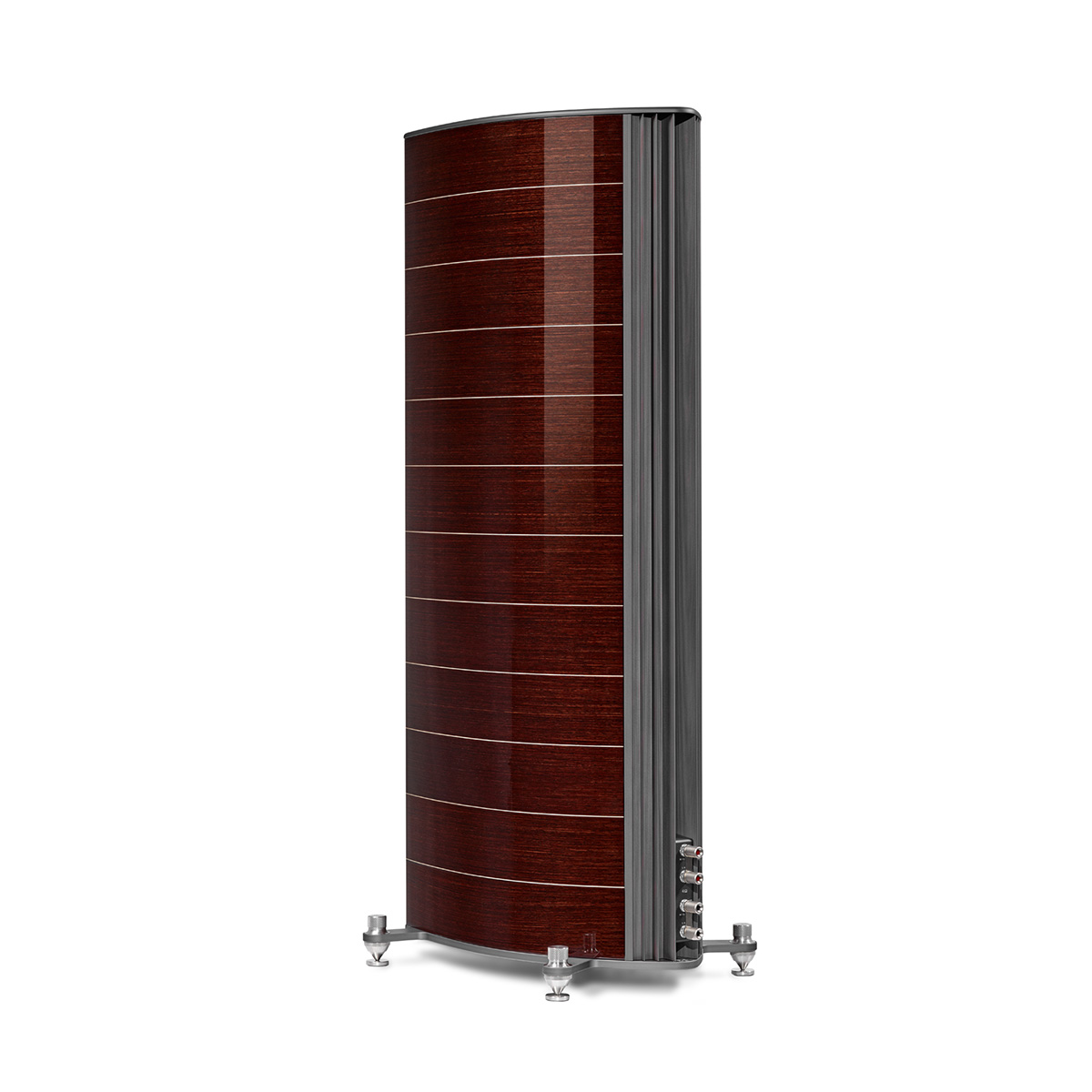 Van bovenaf gezien hebben de behuizingen van de Homage-luidsprekers de vorm van een luit. De gebogen vorm van de zijwanden van de behuizing is niet alleen mooi om te zien maar voorkomt ook in hoge mate het ontstaan van staande golven (lees: vervelende resonanties).