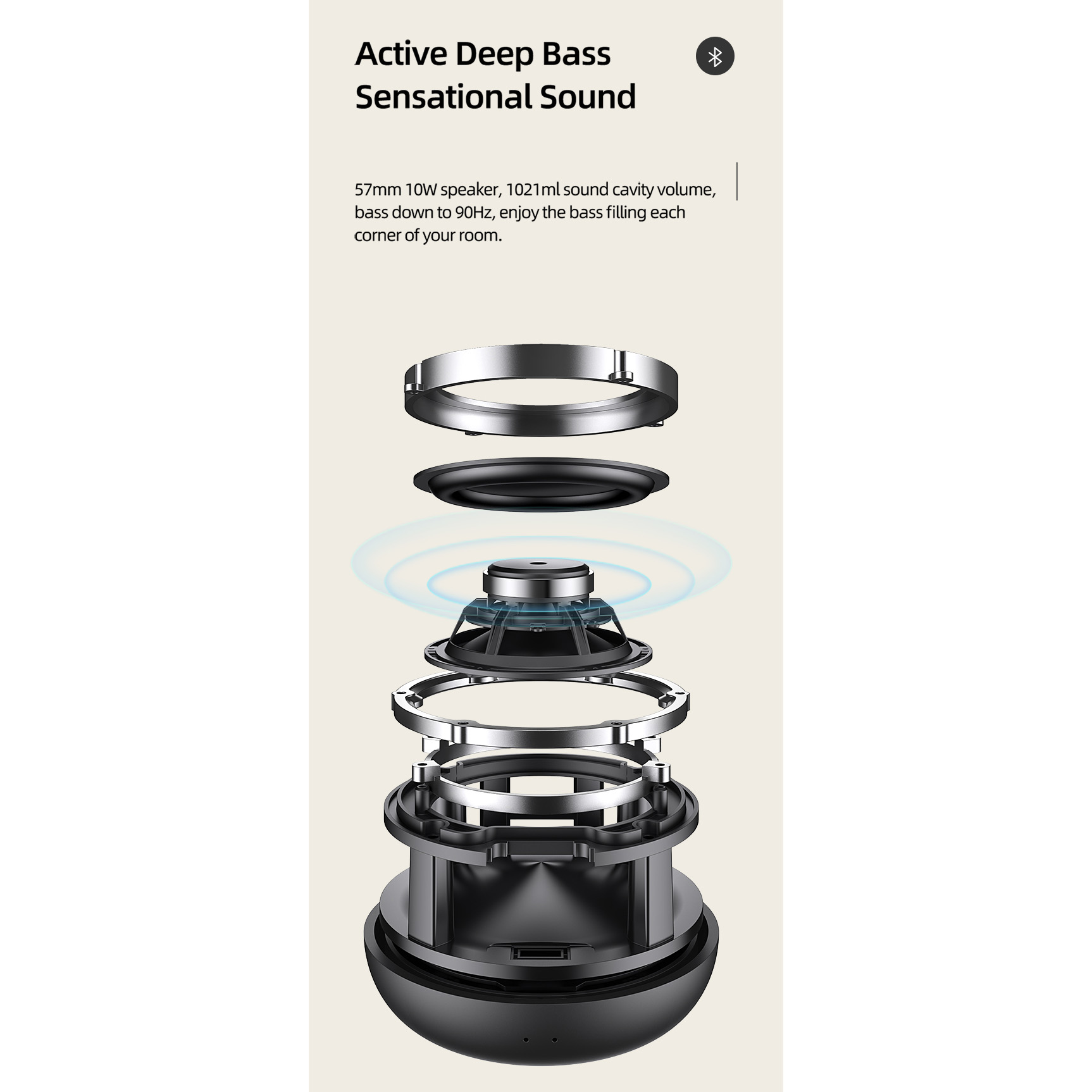 De 57mm 10W luidspreker zorgt voor een krachtige geluidsweergave met bassen die reiken tot 90Hz. Elke hoek van de kamer wordt gevuld met diepe, meeslepende basgeluiden, waardoor je een meeslepende luisterervaring hebt.