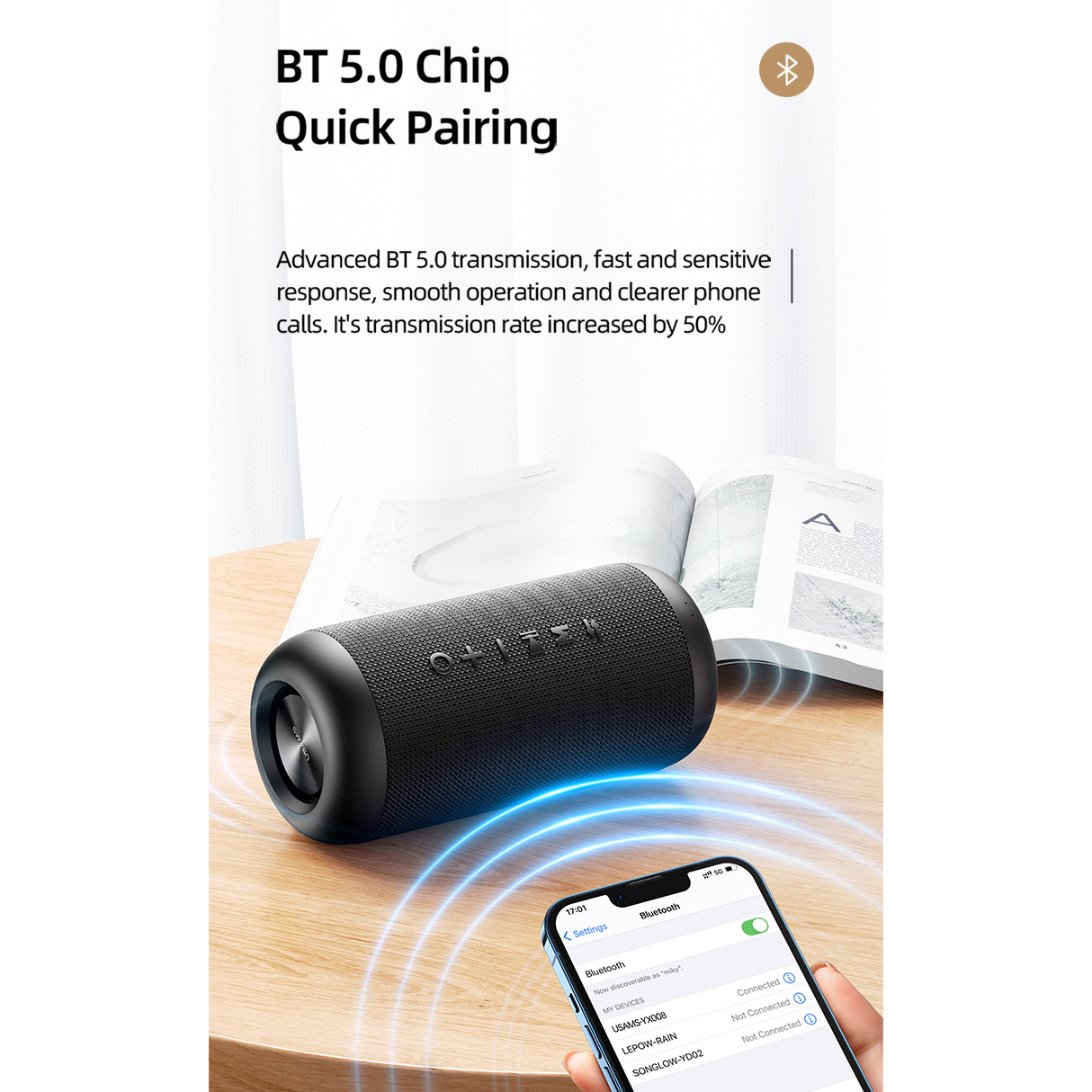 Met de geavanceerde BT 5.0-transmissie geniet je van een snelle en gevoelige respons, vloeiende bediening en heldere telefoongesprekken. De transmissiesnelheid is met 50% verhoogd, zodat je kunt genieten van een stabiele draadloze verbinding.